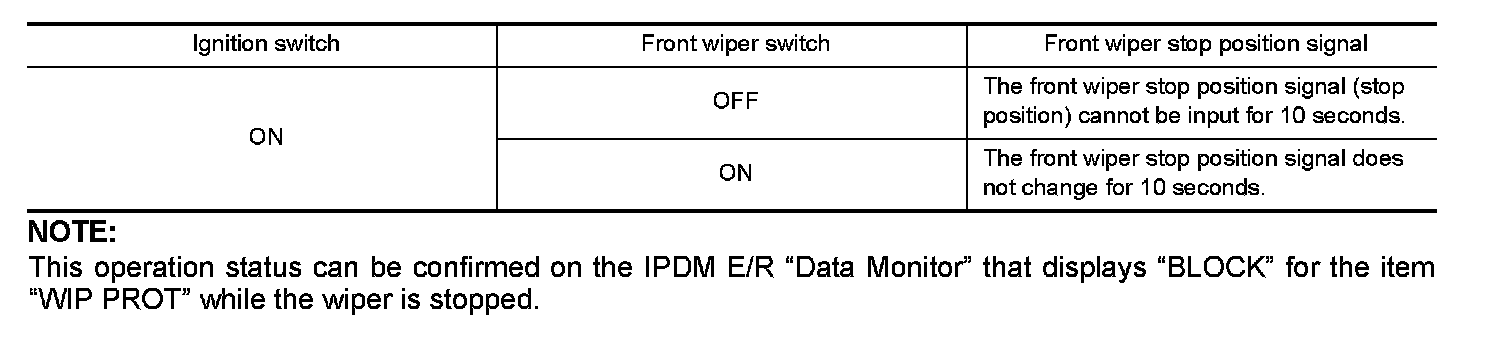 This operation status can be confirmed on the IPDM E/R "Data Monitor" that displays "BLOCK" for the item "WIP PROT" while the wiper is stopped.