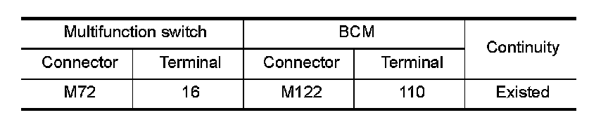 3.Check continuity between the multifunction switch harness connector and the BCM harness connector.