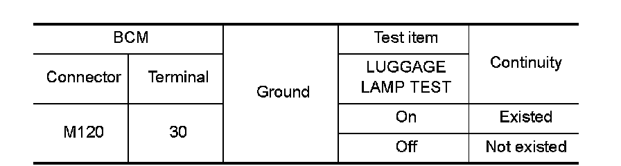 3.With operating the test items, check that trunk room lamp turns ON/OFF.