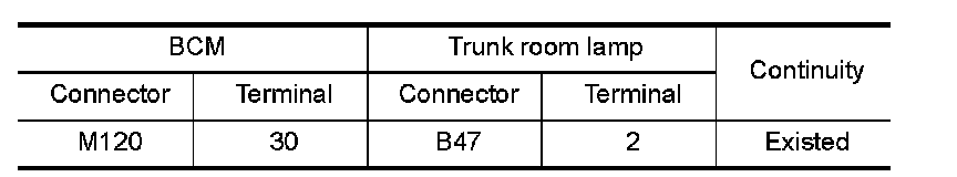 3.Check continuity between BCM harness connector and trunk room lamp harness connector.