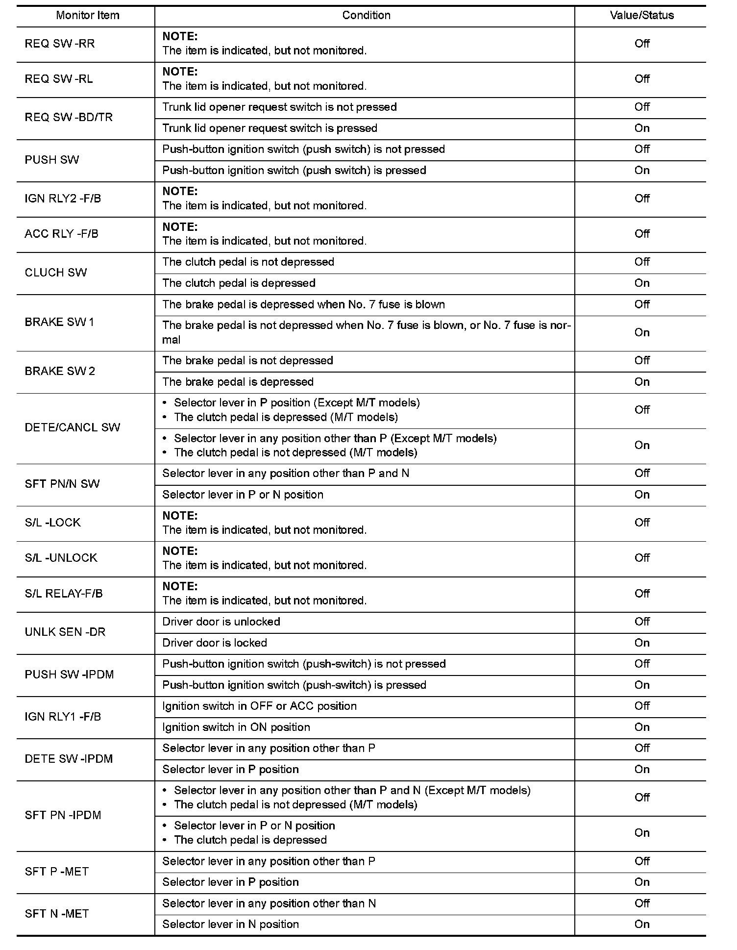 The following table includes information (items) inapplicable to this vehicle. For information (items) applicable to this vehicle, refer to CONSULT display items.