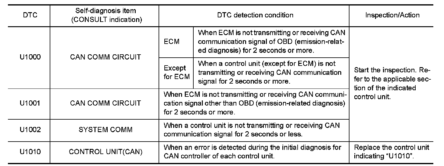 If communication signals cannot be transmitted or received among units communicating via CAN communication line, CAN communication-related DTC is displayed on the CONSULT "Self Diagnostic Result" screen.