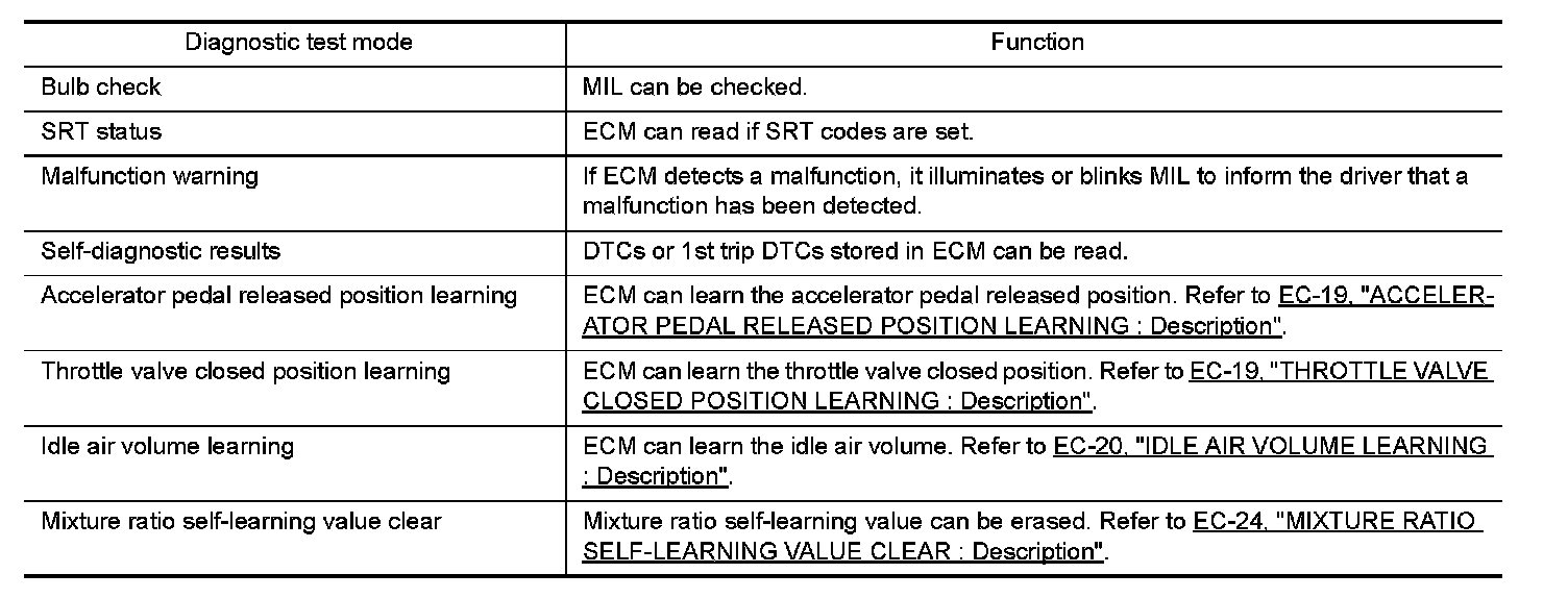 This function allows to read if ECM has completed the self-diagnoses of major emission control systems and components. For SRT, refer to "DIAGNOSIS DESCRIPTION : System Readiness Test (SRT) Code" System Readiness Test (SRT) Code.