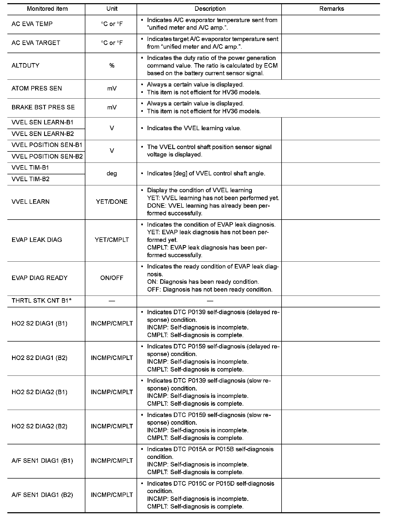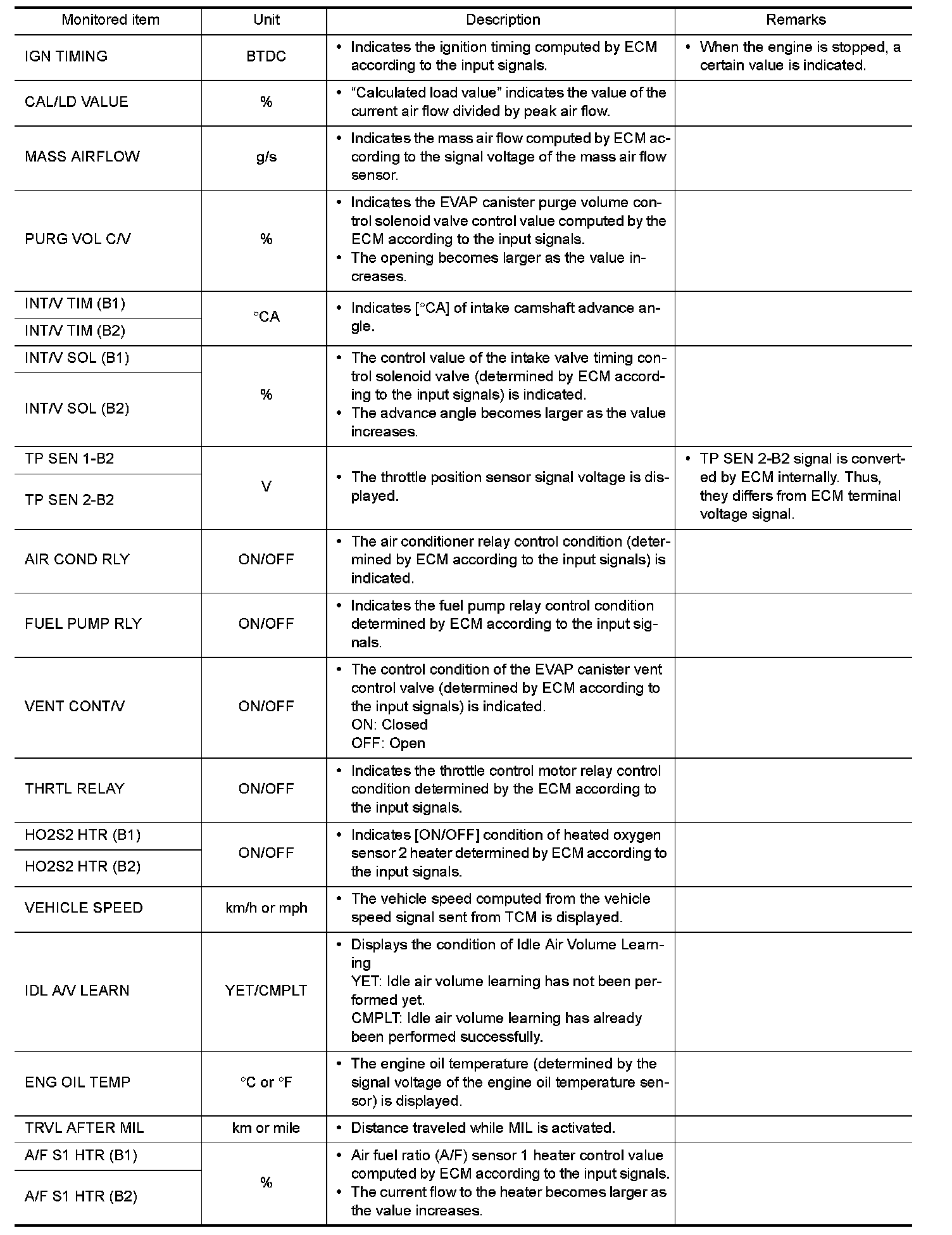 The following table includes information (items) inapplicable to this vehicle. For information (items) applicable to this vehicle, refer to CONSULT display items.