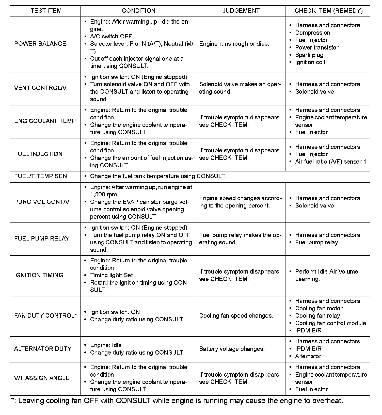 *: Leaving cooling fan OFF with CONSULT while engine is running may cause the engine to overheat.
