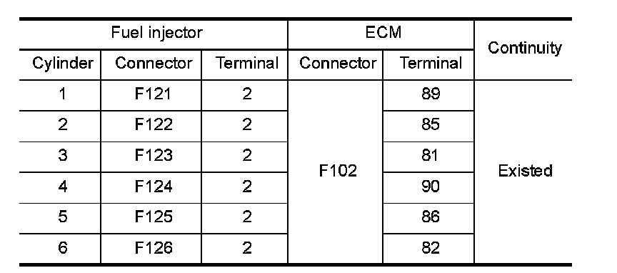 - Harness for open or short between fuel injector and ECM