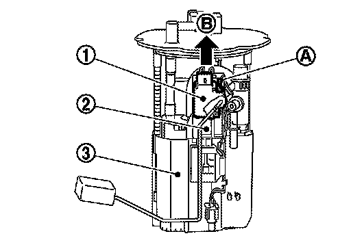 b.After fixing tabs are disengaged, slide main fuel level sensor unit out in direction shown by the arrow (B).