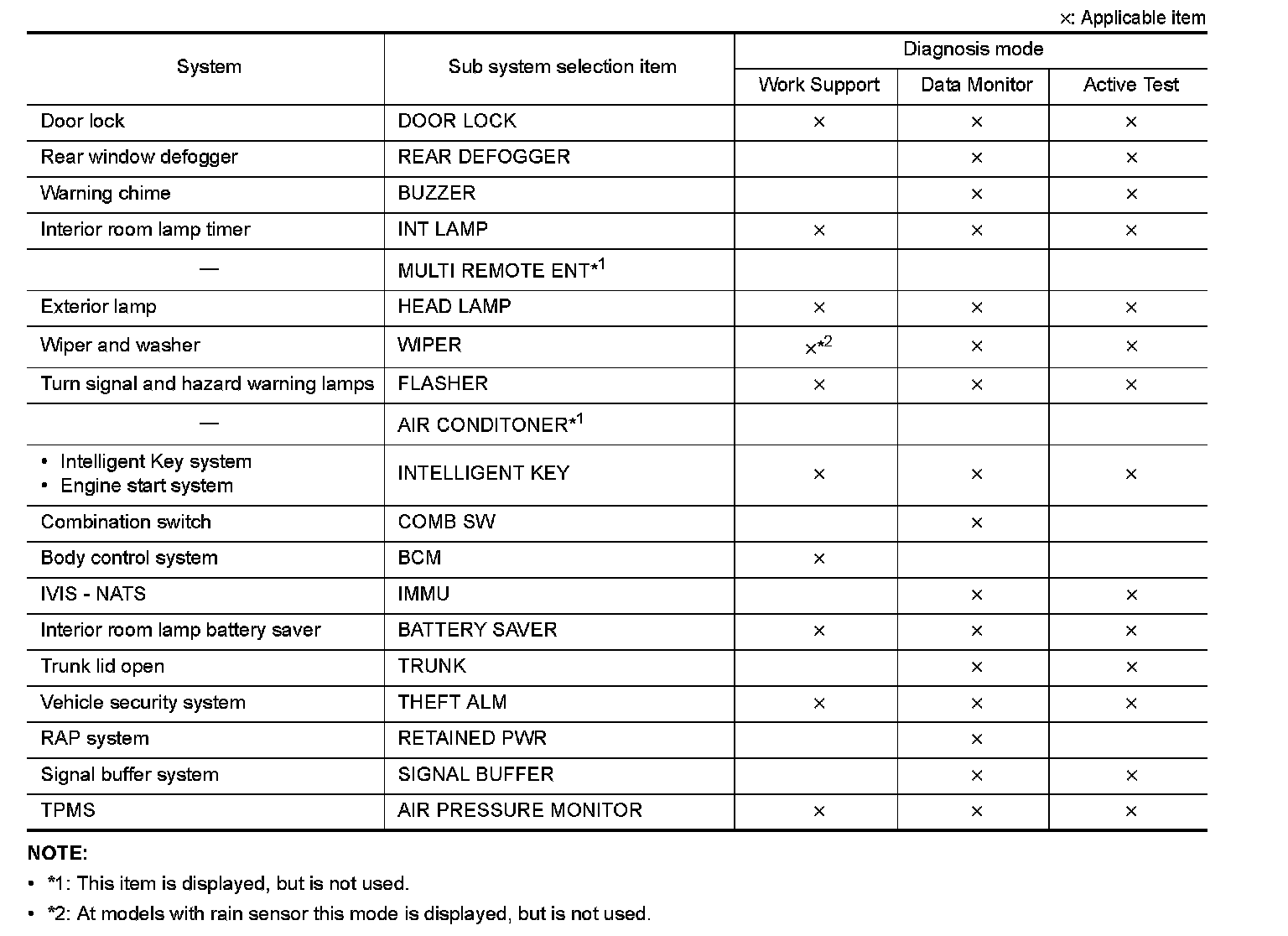 It can perform the diagnosis modes except the following for all sub system selection items.