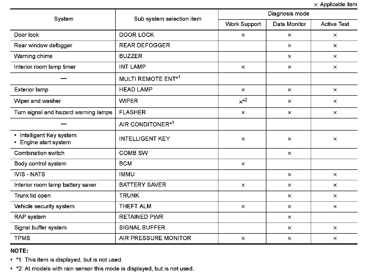 It can perform the diagnosis modes except the following for all sub system selection items.