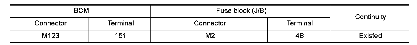 3.Check continuity between BCM harness connector and fuse block (J/B) harness connector.