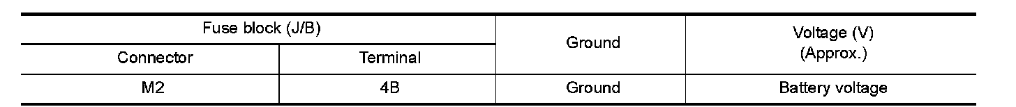 3.Check voltage between fuse block (J/B) (fuse block side) and ground.