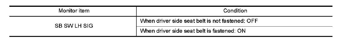 When checking "SB SW LH SIG" on DATA MONITOR screen, check that ON/OFF display changes synchronized with the insertion operation to the seat belt buckle.