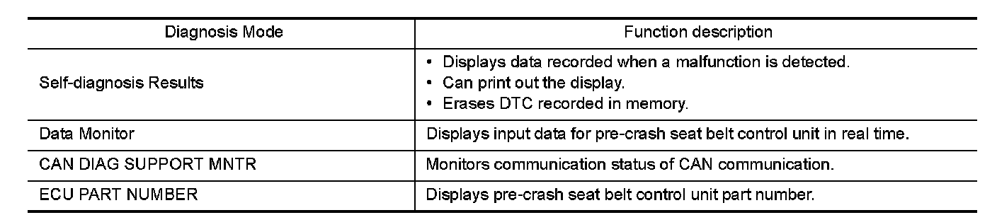 Diagnosis for pre-crash seat belt system can be performed using CONSULT.