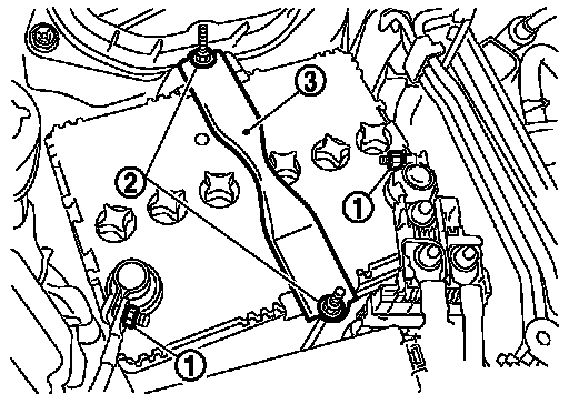 5.Remove battery fix frame mounting nuts (2) and battery fix frame (3).