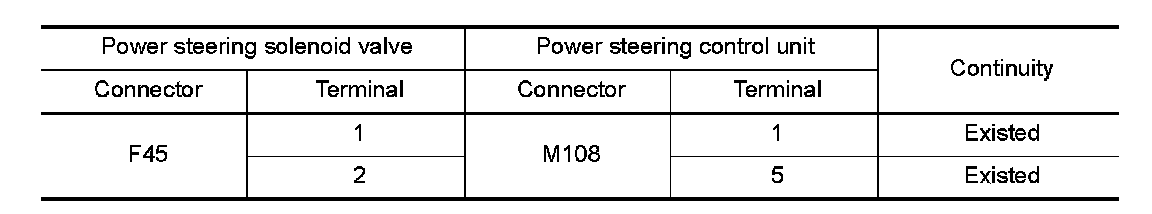 4.Check power steering solenoid valve by listening for its operation sound while applying battery voltage to power steering solenoid valve connector F45 terminals 1 (positive) and 2 (negative).