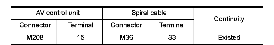 2.Check continuity between AV control unit harness connector and spiral cable harness connector.