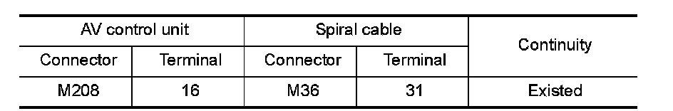 2.Check continuity between AV control unit harness connector and spiral cable harness connector.