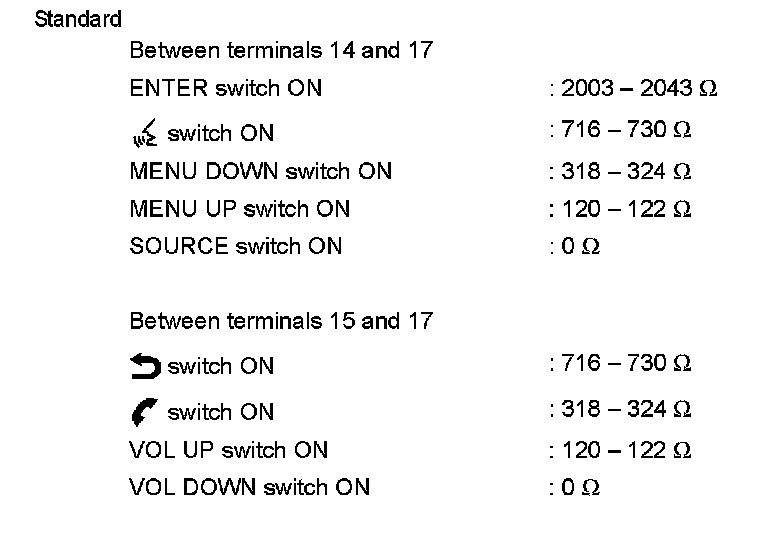 Measure the resistance between the steering switch connector terminals 14 to 17 and 15 to 17.