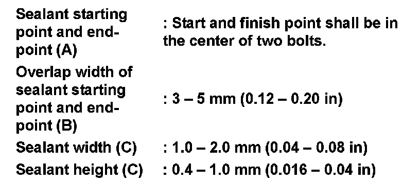 - Apply recommended sealant (Genuine Anaerobic Liquid Gasket or equivalent. Refer to "Recommended Chemical Products and Sealants" Recommended Chemical Products and Sealants.) to rear extension assembly as shown in the figure.