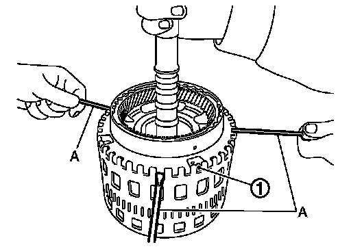 6.Compress snap ring (1) using flat-bladed screwdrivers (A).