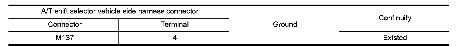 Check continuity between A/T shift selector vehicle side harness connector terminal and ground.