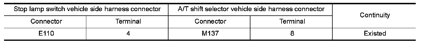 Check continuity between stop lamp switch vehicle side harness connector terminal and A/T shift selector vehicle side harness connector terminal.