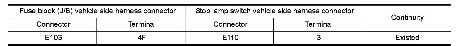 3.Check continuity between fuse block (J/B) vehicle side harness connector terminal and stop lamp switch vehicle side harness connector terminal.