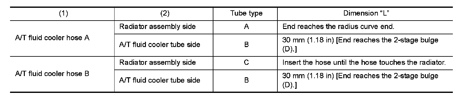 - Insert A/T fluid cooler hoses according to dimension "L" described below.