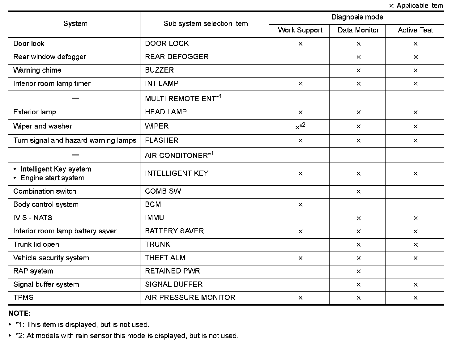 It can perform the diagnosis modes except the following for all sub system selection items.