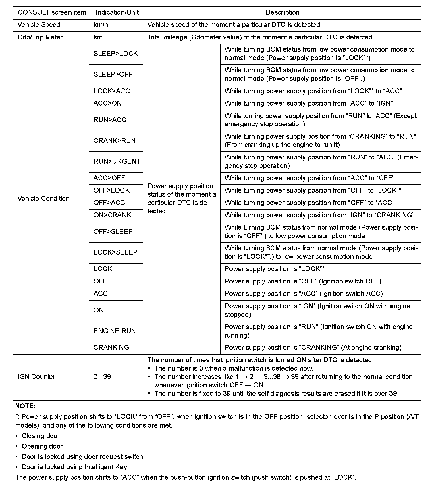 The BCM records the following vehicle condition at the time a particular DTC is detected, and displays on