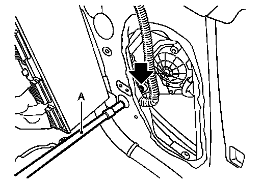 4.Remove quarter window glass regulator assembly fixing nut as shown in the figure with socket wrench (A).