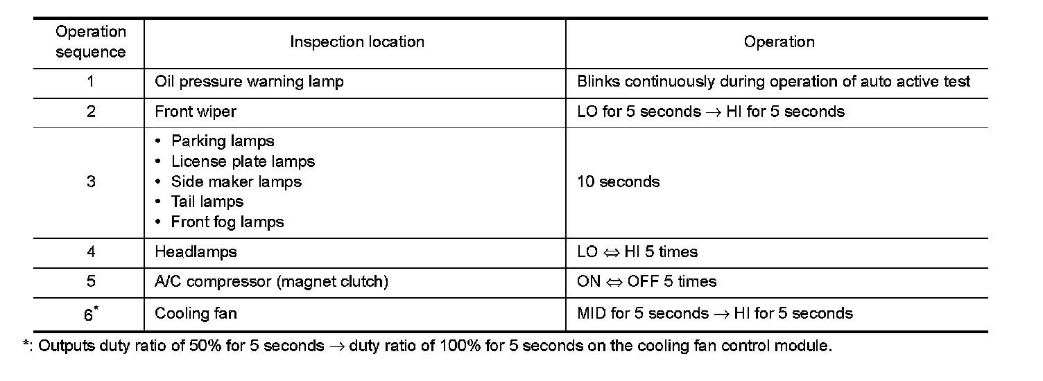 In auto active test mode, the IPDM E/R sends a drive signal to the following systems to check their operation.