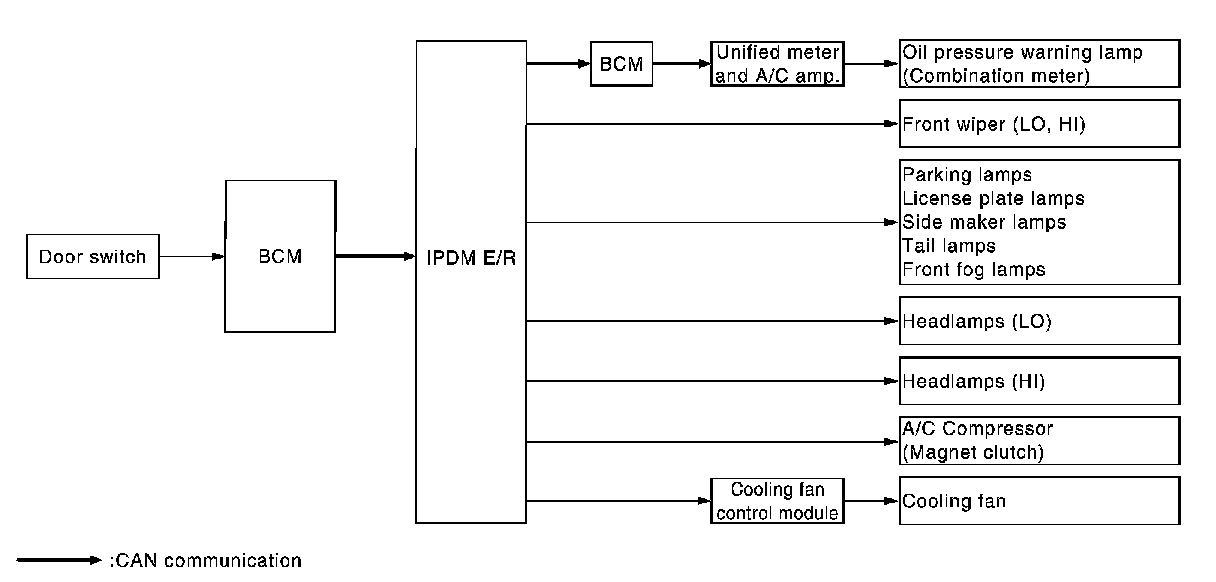 - IPDM E/R starts the auto active test with the door switch signals transmitted by BCM via CAN communication. Therefore, the CAN communication line between IPDM E/R and BCM is considered normal if the auto active test starts successfully.