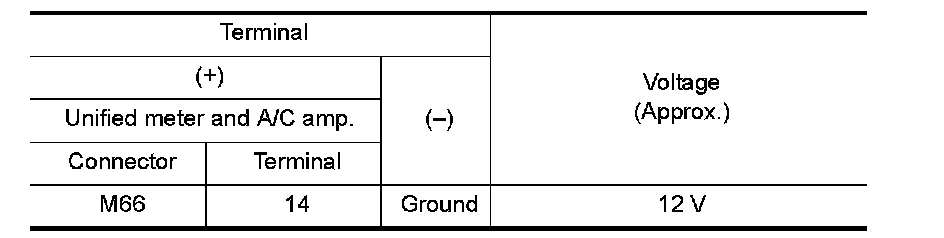 3.Check voltage between unified meter and A/C amp. harness connector terminal and ground.