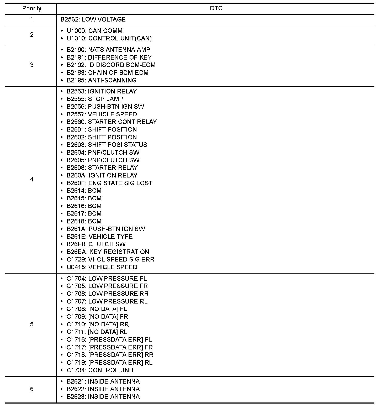 If some DTCs are displayed at the same time, perform inspections one by one based on the following priority chart.