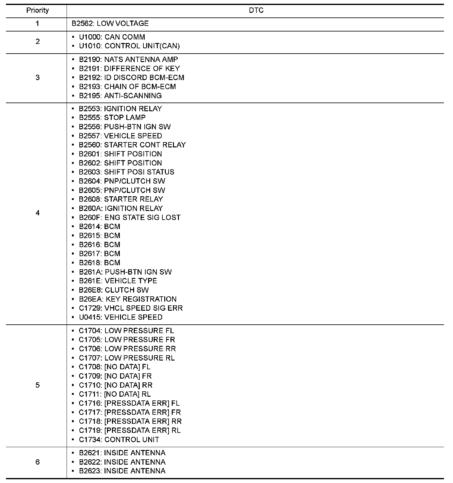 If some DTCs are displayed at the same time, perform inspections one by one based on the following priority chart.