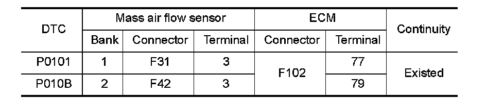 1.Check the continuity between mass air flow sensor harness connector and ECM harness connector.