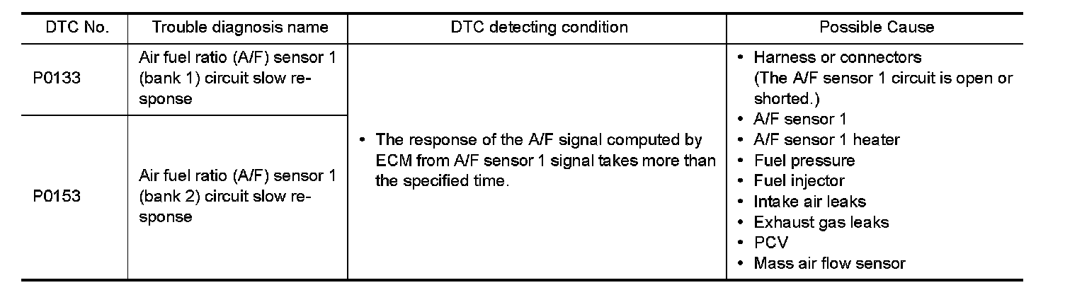 To judge malfunctions, this diagnosis measures response time of the A/F signal computed by ECM from the A/