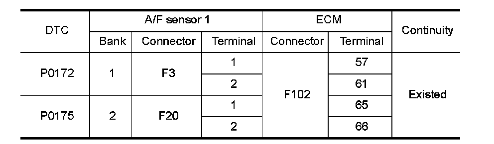 4.Check the continuity between A/F sensor 1 harness connector and ECM harness connector.