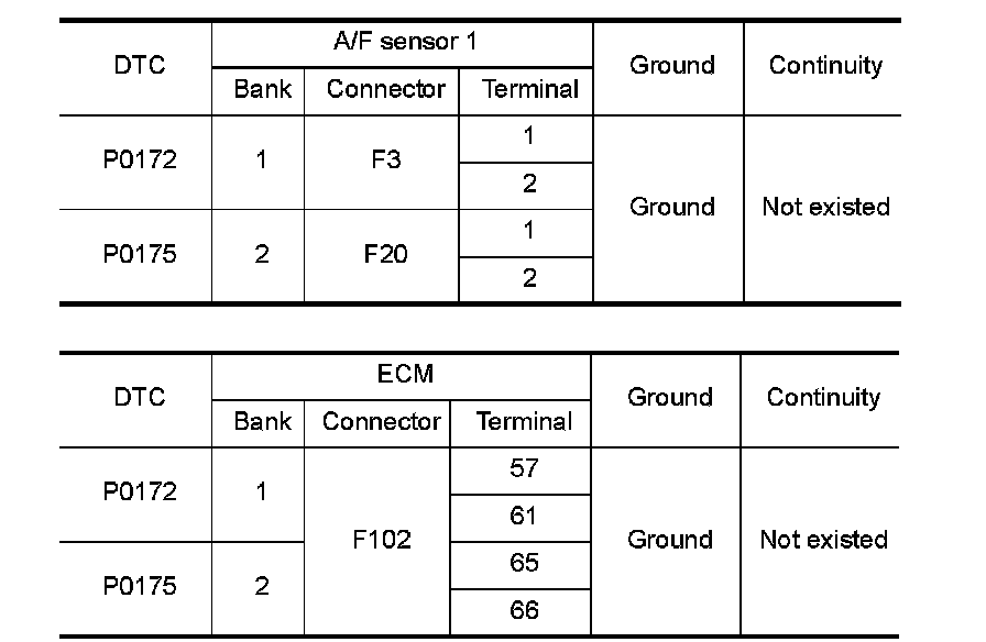 5.Check the continuity between A/F sensor 1 harness connector and ground, or ECM harness connector and ground.