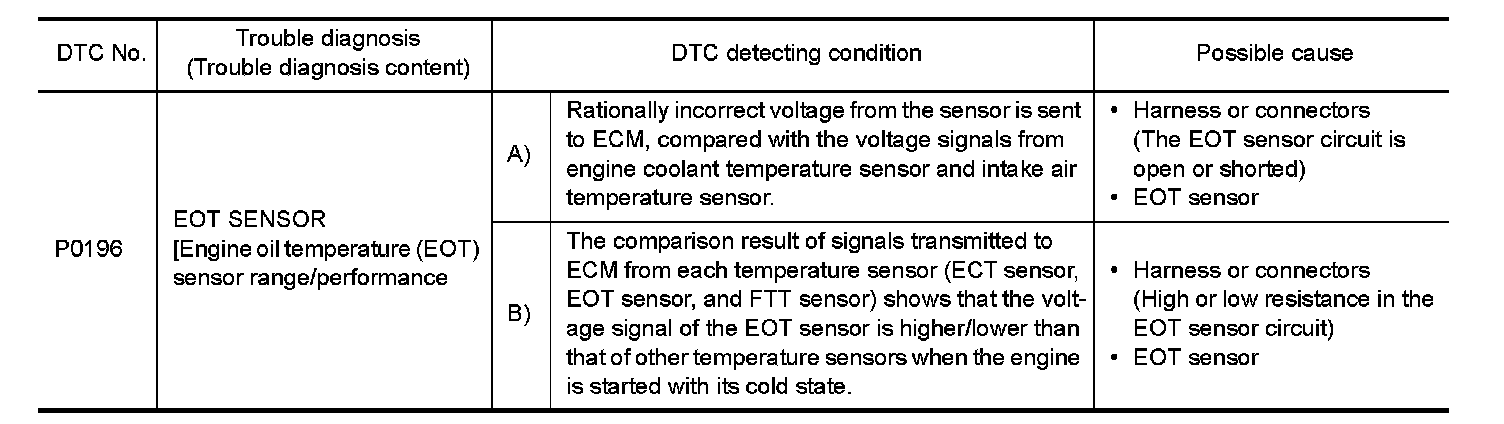 If DTC P0196 is displayed with P0197 or P0198, first perform the trouble diagnosis for DTC P0197 or