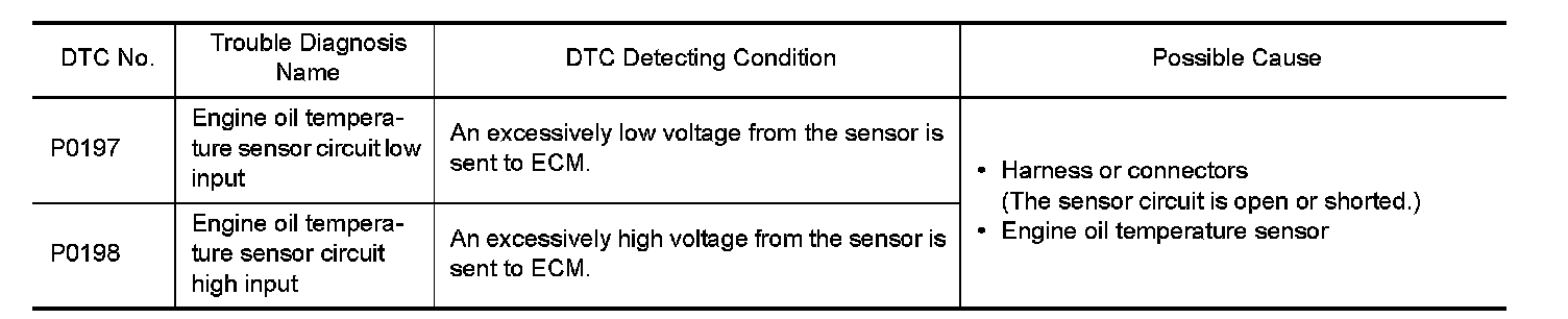 NO- Replace engine oil temperature sensor. Refer to EM225, "2WD : Exploded View".
