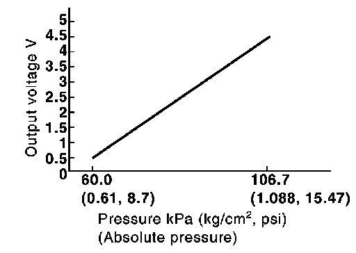 The EVAP control system pressure sensor detects pressure in the purge line. The sensor output voltage to the ECM increases as pressure increases.
