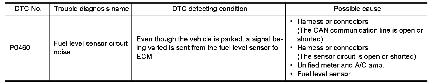 -If DTC P0460 is displayed with DTC P0607, first perform the trouble diagnosis for DTC P0607. Refer to "DTC Logic" P0607.
