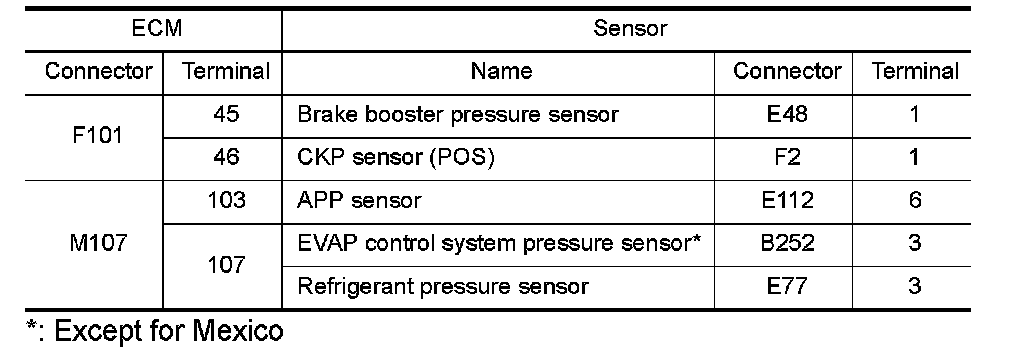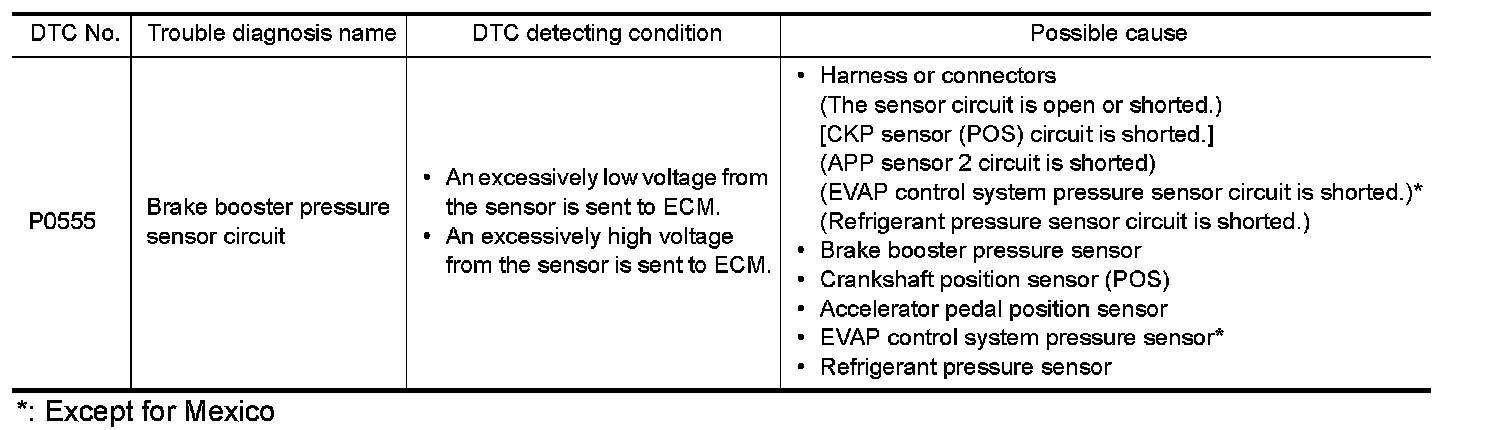 - EVAP control system pressure sensor (Refer to "Component Inspection" P0451.) (Except for Mexico)