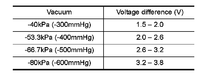 6.Check that the difference of the voltage when engine is stopped and that when negative pressure is applied with vacuum pump is within the following limits.
