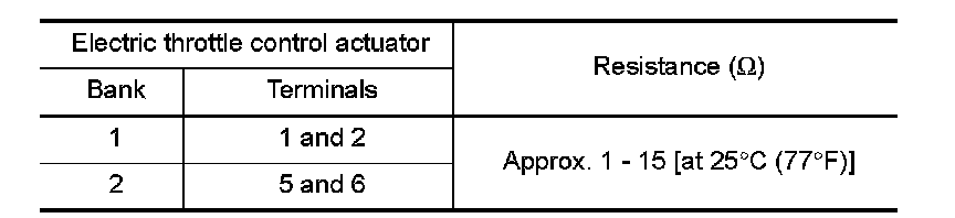 3.Check resistance between electric throttle control actuator terminals as per the following.