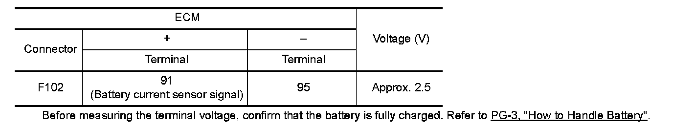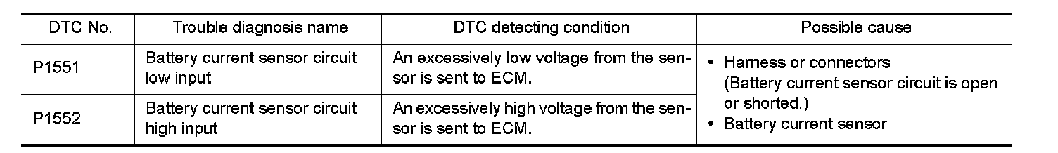 The power generation voltage variable control enables fuel consumption to be decreased by reducing the engine load which is caused by the power generation of the generator. The battery current sensor is installed to the battery cable at the negative terminal. The sensor measures the charging/discharging current of the battery. Based on the sensor signal, ECM judges whether or not the power generation voltage variable control is performed. When performing the power generation voltage variable control, ECM calculates the target power generation voltage based on the sensor signal. And ECM sends the calculated value as the power generation command value to IPDM E/R. For the details of the power generation voltage variable control, refer to CHG10, "System Description".