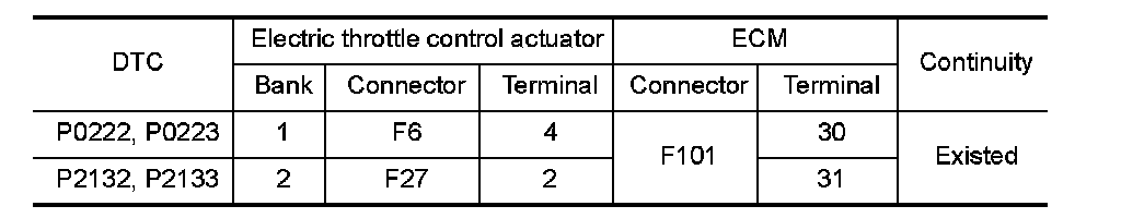 1.Check the continuity between electric throttle control actuator harness connector and ECM harness connector.