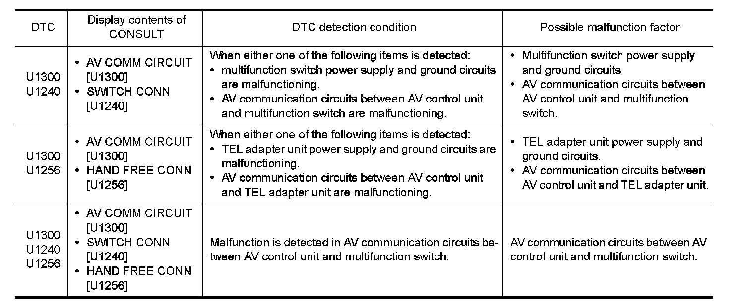 U1300 is indicated when malfunction occurs in communication signal of multi AV system. Indicated simultaneously, without fail, with the malfunction of control units connected to AV control unit with communication line.